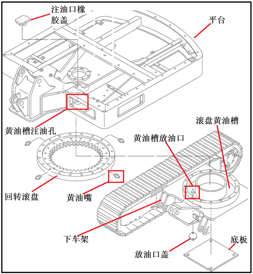 ②需不定期对回转装置啮合齿处,即黄油槽内的黄油进行检查、添加、更换;可通过黄油槽注油孔和放油口进行添加和排放;