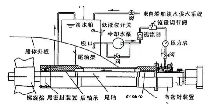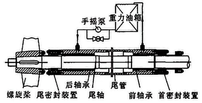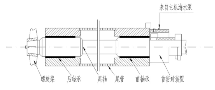 图2为闭式水润滑艉轴艉管装置,由艉管、白合金轴承、首尾密封装置、油柜及其管路等系统组成,以滑油为冷却和润滑剂。