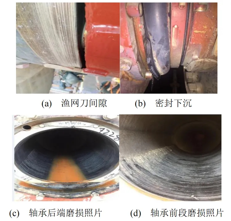 船舶进坞后检查艉密封情况,发现艉密封进坞检查后发现,桨毂与防护罩渔网刀之间明显出现下沉,渔网刀已刮到桨毂,设计原间隙有5mm左右,可以推测轴承已磨损约5mm,见图3。